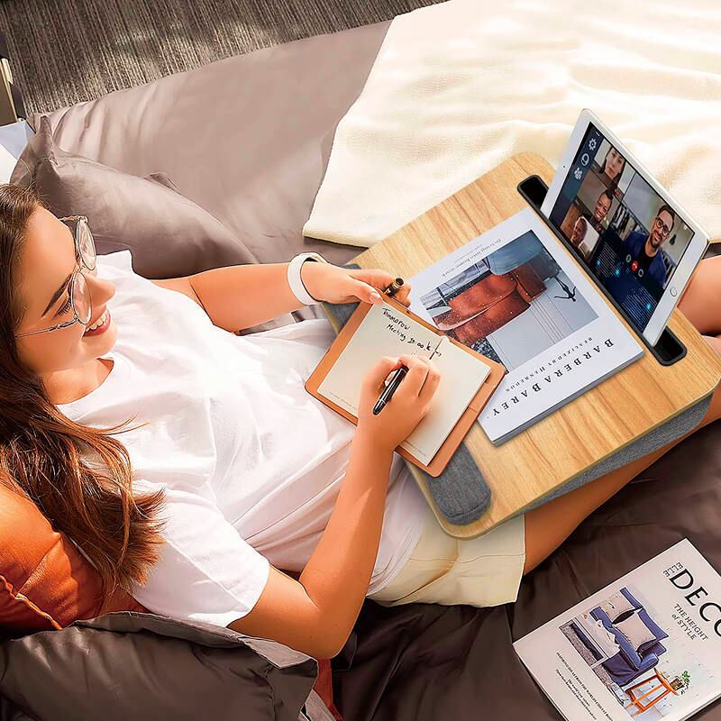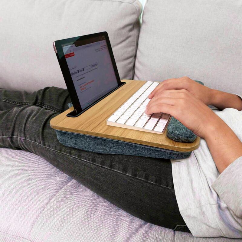 ラグジュアリーな快適さを手に入れるための1枚、ひざうえデスク。ソファー、ベッド、床など、どんな場所でもお気に入りの姿勢で作業ができる便利さが魅力です。アームレストが付いているので長時間の作業でも疲れにくく、PCも滑り落ちることがありません。更に裏面には柔らかいクッションが付いているので、膝が痛くなる心配もありません。こちらの商品は、忙しい日々の中でも、心地よい環境を提供し、リラックスした時間を楽しむことができる新たなスタイルを提案します。