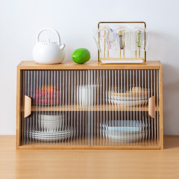 ・清潔感のあるガラス扉付きのキッチン収納ラックです。