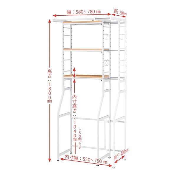 棚板は50mmピッチで高さが変えられるので、一人暮らし用のコンパクトな冷蔵庫や洗濯機もスッキリ収まります。